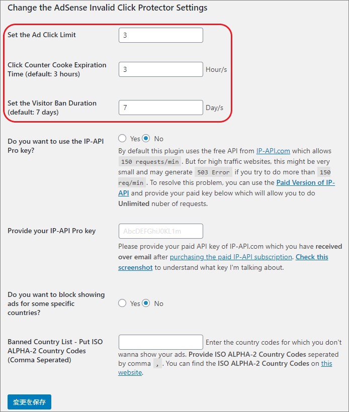Set the Visitor Ban Duration (default: 7 days):連続クリックが発生してから、広告表示を停止する期間