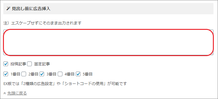 赤枠部にショートコードを入力するんですが、AFFINGER5(WING)では【見出し前に広告挿入】のショートコードは未対応なので広告の設置を諦めました。