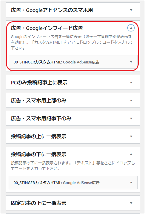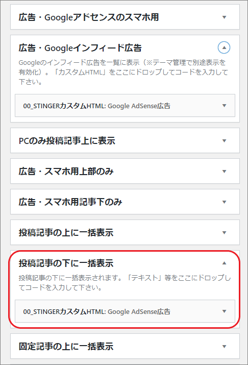 に設置していますが、それぞれの広告コードを作成したショートコードに変更していきます。